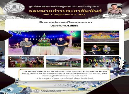 วันที่ 5 พฤศจิกายน 2568 นายนพรัตน์ มุกดา ผู้อำนวยการศูนย์ส่งเสริมการเรียนรู้ระดับอำเภอภักดีชุมพล มอบหมายให้บุคลากรศูนย์ส่งเสริมการเรียนรู้ระดับอำเภอภักดีชุมพล เข้าร่วมโครงการสืบสานประเพณีลอยกระทง ประจำปีงบประมาณ 2569 และได้กล่าวถวายอาลัย ยืนสงบนิ่งเป็น